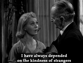 Je repense à Blanche Dubois, la femme terrifiée à l’idée de vieillir et qui, pour ne pas être une nouvelle fois exclue, simule et exagère ses qualités de séduction face aux hommes qu’elle rencontre chez sa sœur, son beau-frère et son ami, cherchant peut-être, sans doute, leur protection. Ne pas leur plaire pourrait signifier devoir partir, vivre l’exclusion, or Blanche a épuisé tous les recours dont elle disposait et n’a plus nulle part où aller.