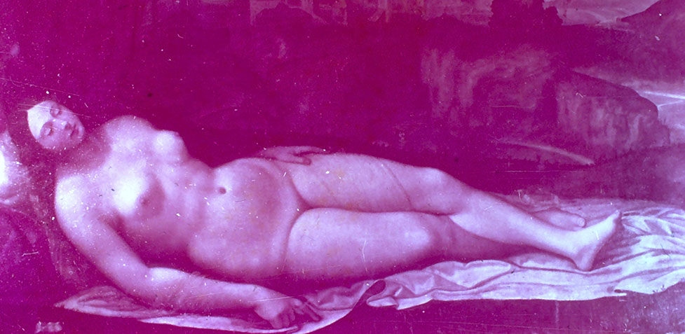 À l’origine de La guerre des images, il y a une diapositive que j’ai trouvée en 2020 dans une benne à ordures. Une image minuscule et fascinante qui représente une Vénus allongée devant un paysage chaotique : une cité lointaine qui paraît brûler. Sous les colonnes de fumée noires et menaçantes, la Vénus est impassible, elle tourne le dos à l’apocalypse et semble comme endormie.